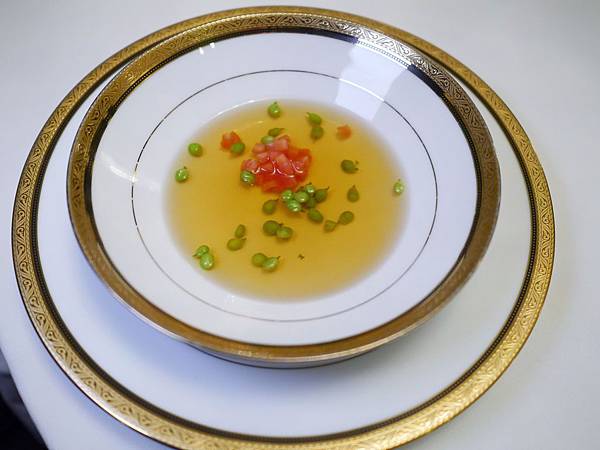 番茄清湯,用牛番茄原汁+番茄肉熬煮兩小時後,沉澱成清湯,搭配牛番茄和甜豆,喝起來呈現番茄天然的香氣,滋味酸酸甜甜、清爽順口