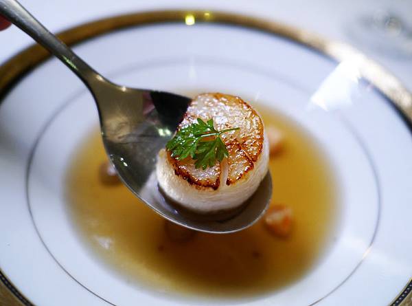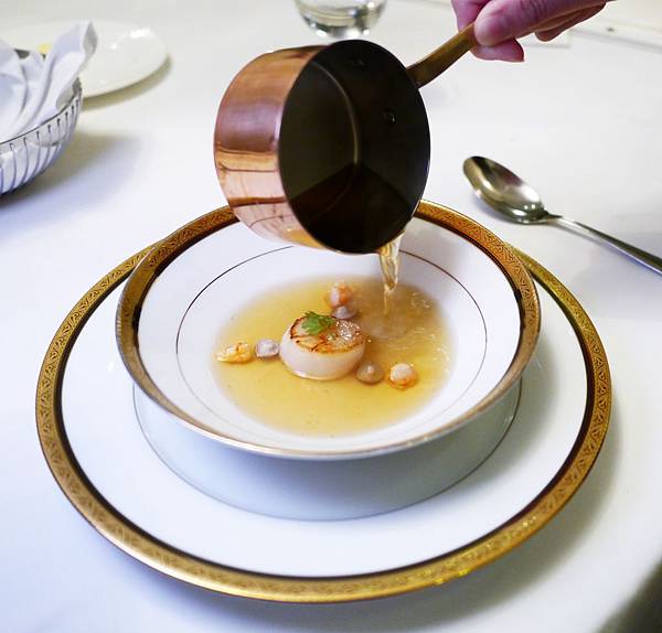 雞肉海鮮清湯,雞高湯是先經過煮14~18小時,再沉澱2小時,搭配日本大干貝,上桌後,才淋上雞高湯