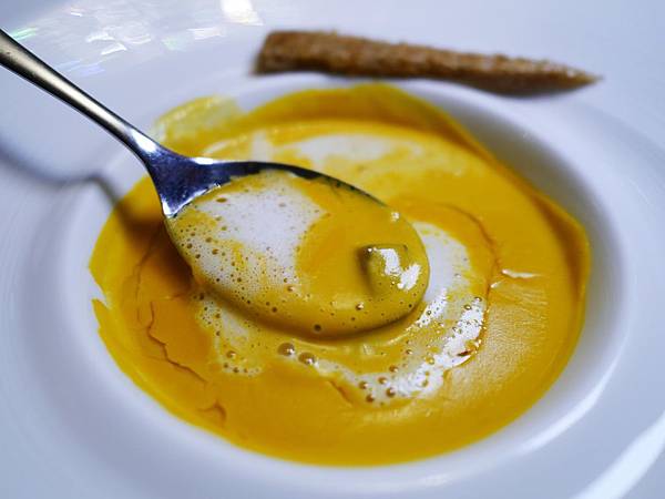 南瓜濃湯,上面的慕絲是用牛奶和栗子打成的,濃湯內也有栗子顆粒,喝起來香濃順口,上面的餅乾是用瑞士的葛瑞爾乳酪做成的,味道非常濃郁,乳酪控的朋友一定會很喜歡