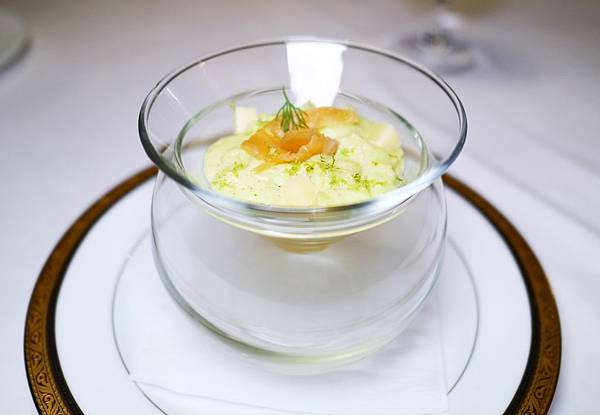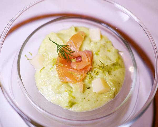 煙燻鮭魚佐青花椰慕絲與乳酪,在三角錐底下是柳橙皮餡、裡面有一層法定產區的綿羊乳酪和芥末凍片,鮭魚是主廚自己用蒔蘿香草去煙燻,上面有康媞乳酪,吃的時候底下的煙燻味會飄上來