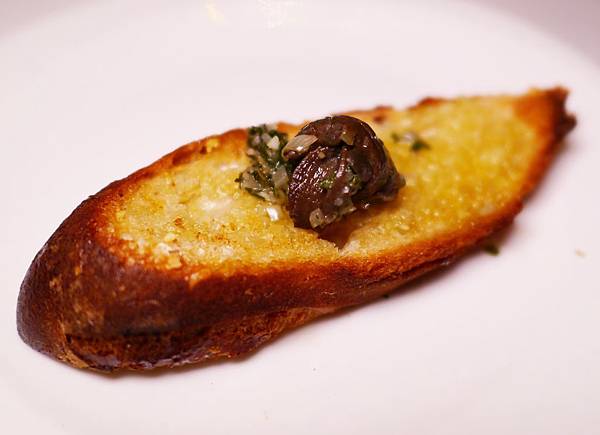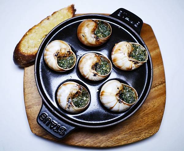 焗烤勃根地蝸牛,跟波爾多蝸牛料理不一樣,波爾多是用切碎的蝸牛肉和蘑菇去炒,勃根地蝸牛料理是用整顆燙熟的蝸牛,去掉內臟後用蒜蓉和巴西利調味後進烤箱烤~