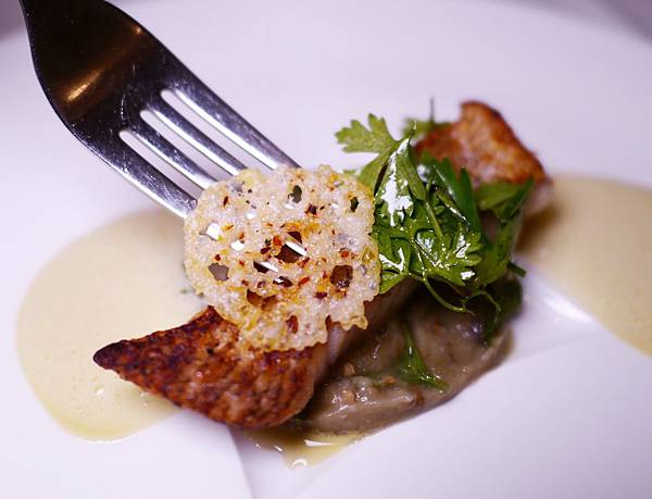 乾煎石斑爐烤日本茄泥佐芫荽慕絲,這道很有南法的田野風味,脆片是用帕馬森起司做的,