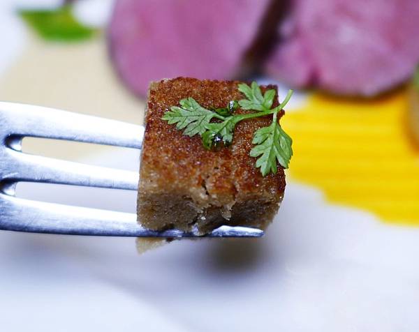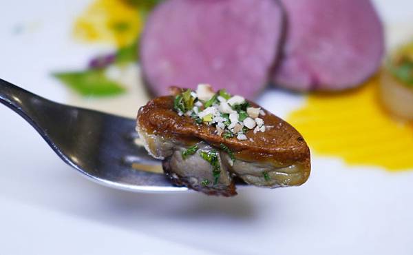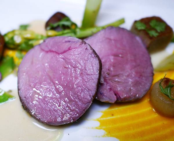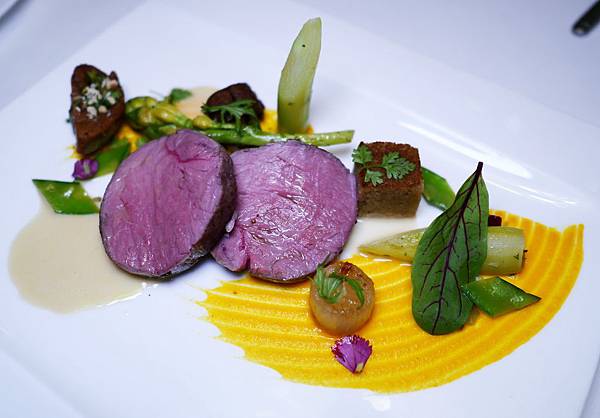 爐烤澳洲小牛菲力、煎牛髓,犢牛搭配鴨肝和煎牛髓,佐檸檬紅蘿蔔泥,因為犢牛肉質軟嫩,但牛味較清淡,因此搭配牛肉味濃郁的煎牛髓可以吃到濃郁的牛肉味和軟嫩的牛肉,