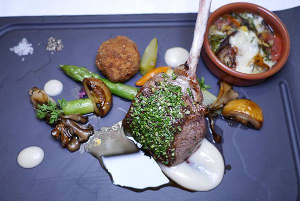 牧草煙燻紐西蘭小羊肋排, 用牧草、迷迭香和百里香煙燻過的紐西蘭小羊肉,是使用3個月大的小羊肉,所以吃起來除了軟嫩之外,完全沒有羊騷味,小羊豆搭配皇帝豆泥