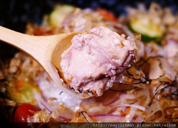 涼拌鱈魚肝,裡面有涼拌洋蔥、蔬菜、鱈魚肝和蝦卵