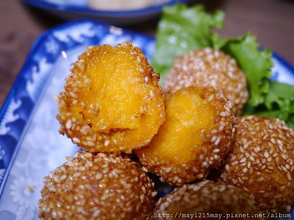 南瓜芝心球,這道菜也大推~外貌似芝麻球的南瓜芝心球,一咬下去,飽滿的南瓜芝麻餡料,立刻流出來,餡料又滑又Q,味道香甜可口