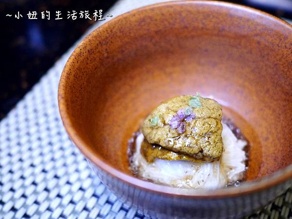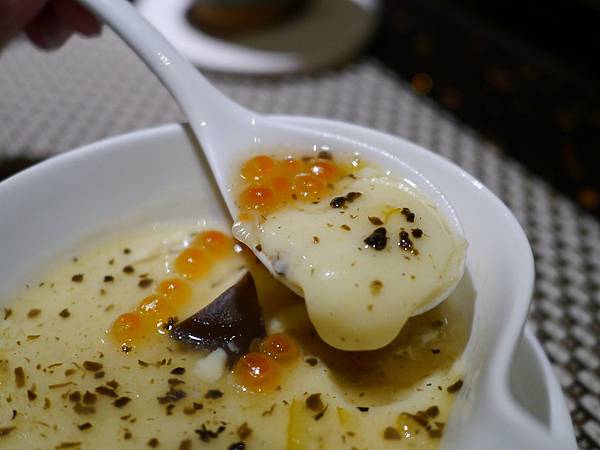 黑白松露蒸蛋佐鮭魚卵,這道菜是名廚長沼笙的私房菜,蒸蛋加上黑白松露醬汁,味道鮮美滑嫩,底層還有香菇、干貝等,是妞媽吃過最美味的蒸蛋!!