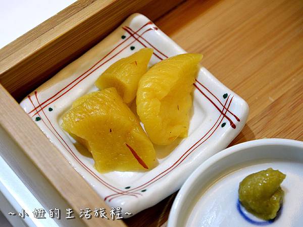 TSUJIRI的芥末是正統日式作法,以芥末籽研磨出來的,不同於市售的山葵醬嗆辣,配菜醃漬蘿蔔吃起來很脆很入味!!
