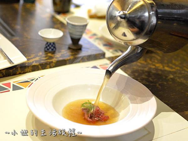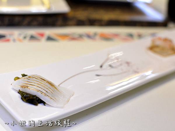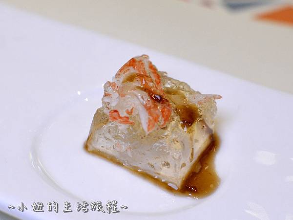 開胃小品,蟹肉白酒晶凍、炙燒軟絲,軟絲味道鮮甜、佐底下的海藻吃起來清爽又開胃