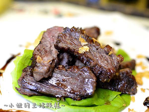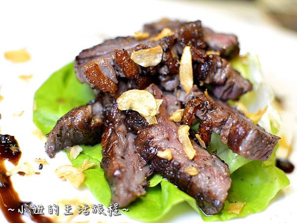 老饕牛排,老饕牛排就是俗稱的上蓋肉,順著肋眼牛肉之筋膜所切下的,是肋眼牛排的精華部位,數量稀少,稱為老饕牛排,算台灣特有的吃法,個人認為老饕牛排的質地類似豬頸肉(松阪豬),大理石油脂花紋分布均勻,肉質口感滑嫩、十分鮮甜、且肉汁滿溢,小洋師傅幫我們煎到約5~7分熟後切片,