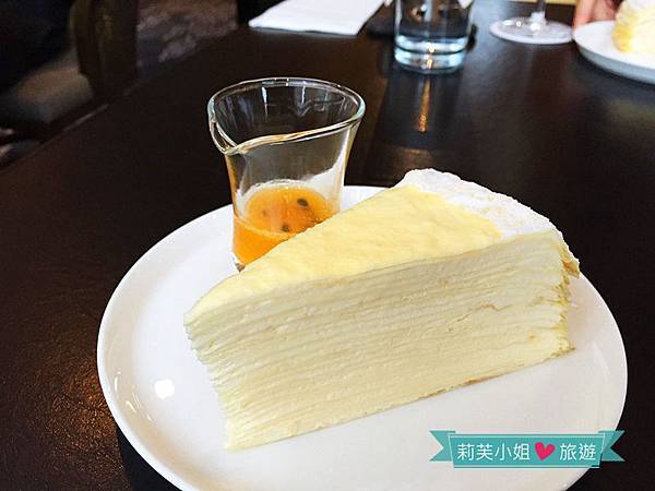 接下來要介紹本日的重點百香果千層蛋糕,也是Lady M為了台灣特別準備的限定口味。因為現場也只提供一種味道,所以怎麼拍都是這塊蛋糕。