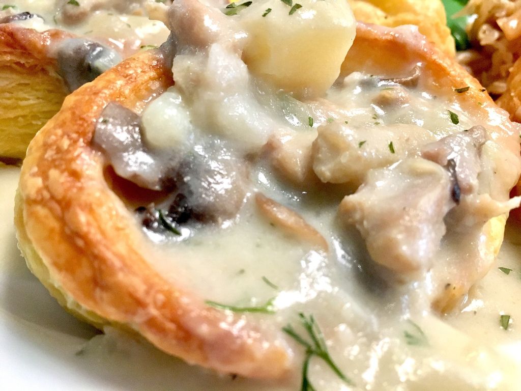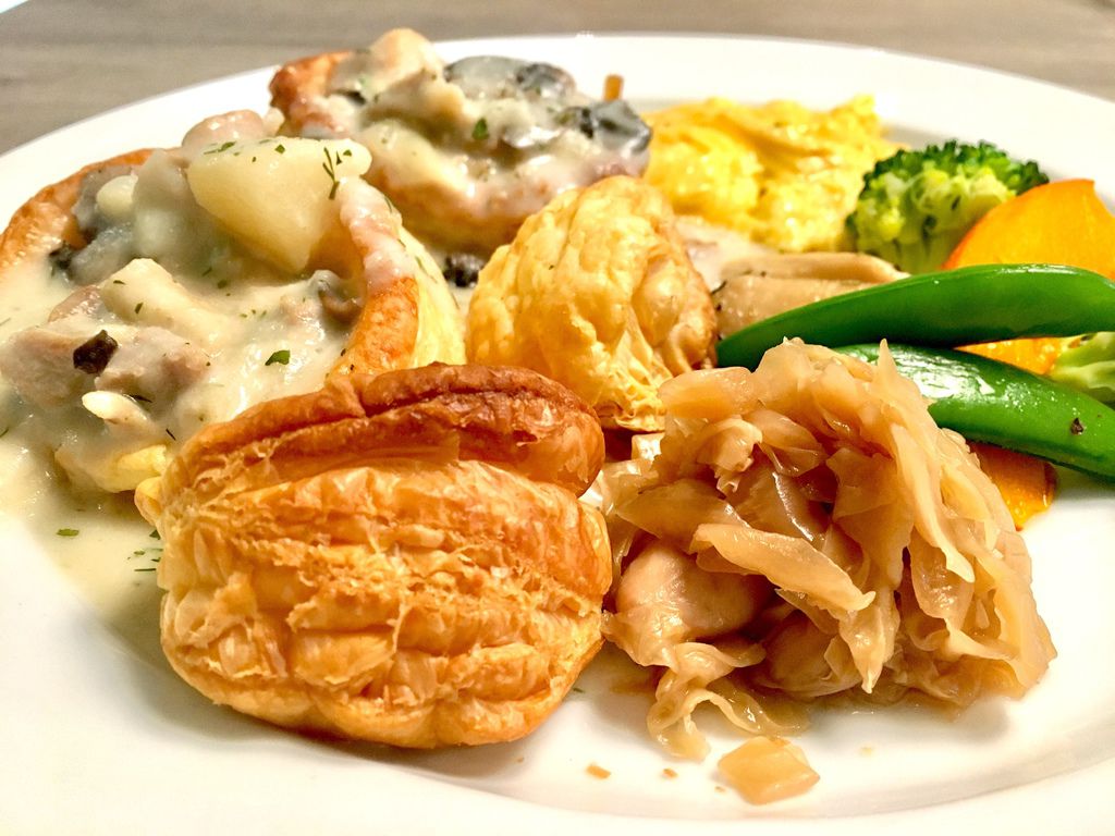 一般荷蘭泡芙/約克夏布丁是用麵粉跟雞蛋去發起來的杯型鬆軟麵包,店家這裡用的是千層酥皮,帶來酥脆的口感,我想是為了要搭配綿密的蘑菇雞肉醬吧! 讓口感上多益種層次的巧思我很喜歡。