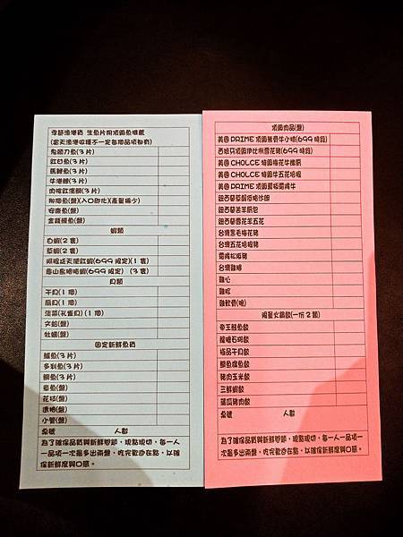 藍色是海鮮單 紅色是肉單