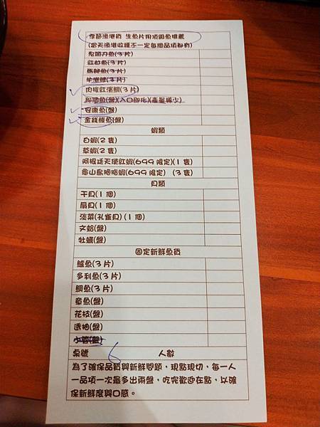 最上面的季節海鮮要看店家當日進貨 像我們這次就是只有打勾的三種