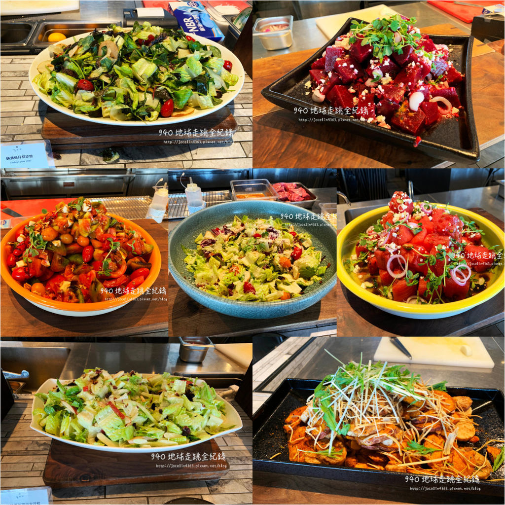 ▲ 醃漬鳥仔梨沙拉/甜菜荔枝百香果沙拉/碳烤番茄馬茲瑞拉沙拉/凱薩沙拉
