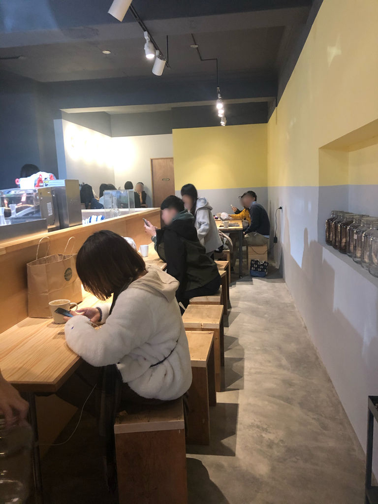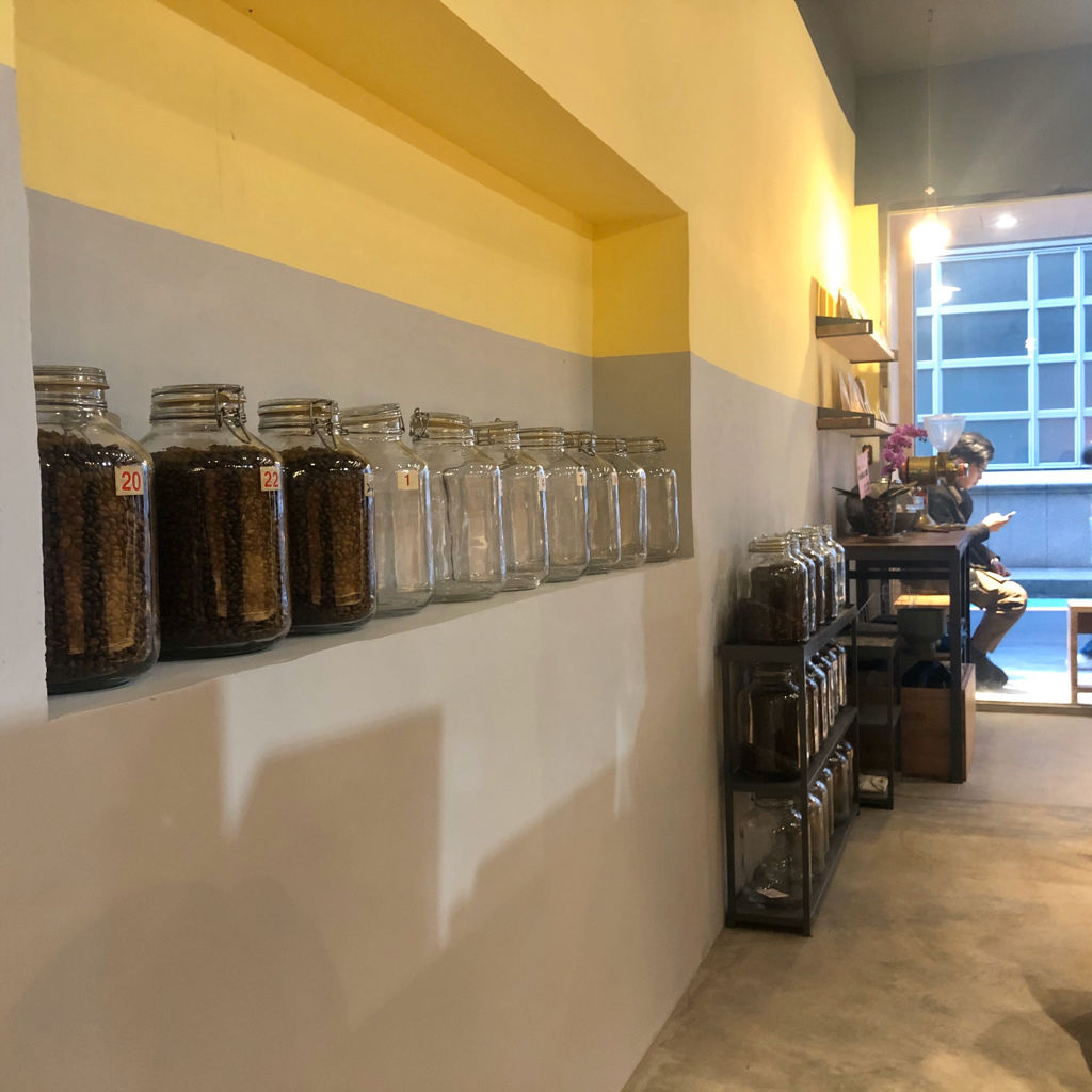 進來後,內部以黃色為主色,配合著投射燈的燈光,在這冬天似乎也感受到暖暖的氣氛,旁邊則陳列著咖啡豆擺設。