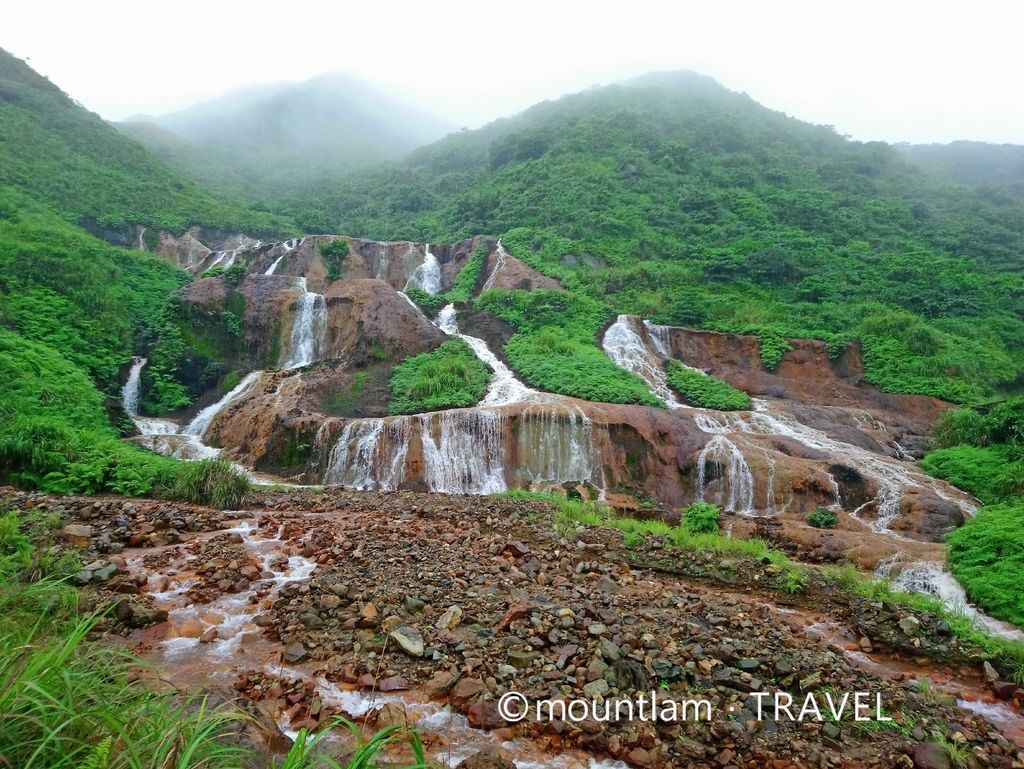 可惜, 天有不測之風雲, 雨越下越大, 幸好導遊司機說下大雨會適當調配行程, 先帶我們到額外的景點---九份的陰陽海和黃金瀑布。陰陽海在大雨之中顏色沒有太大對比, 而黃金瀑布則水量強勁!