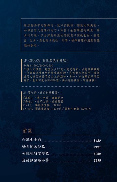 這次聚餐吃到的每道菜都讓大家很滿意,盡興而歸!立刻將它放入我在中山區美食餐廳的口袋名單裡,建議大家來之前先訂位,最好也先預訂菜色,讓店家為你準備最新鮮的當季食材及菜肴,除了菜單上的單點菜色也有1000元以上的日式無菜單料理可預訂!