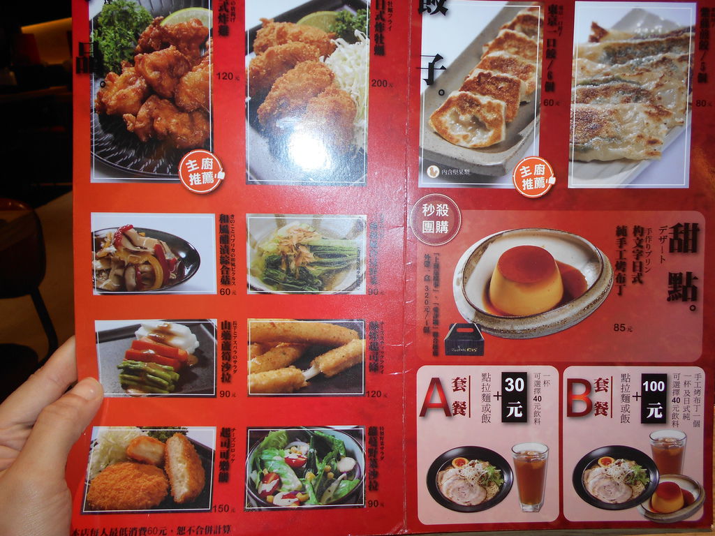 招牌小菜如餃子、日式炸雞,為求口感也是現點現做!我推薦頗受好評的日式炸雞,也有2種套餐價的搭配能享用到招牌純手工烤布丁與40元飲料,增加口感與飽足感!