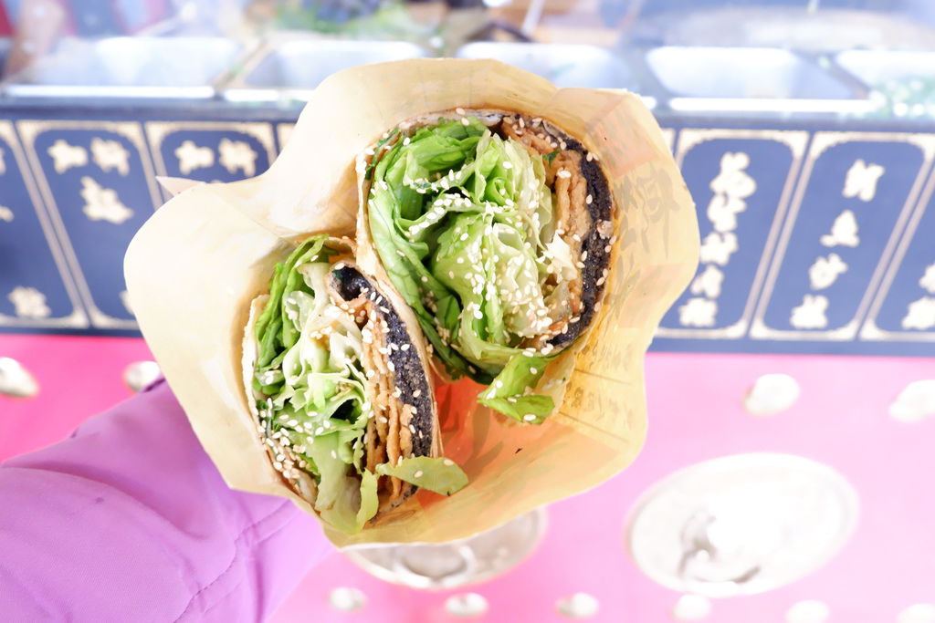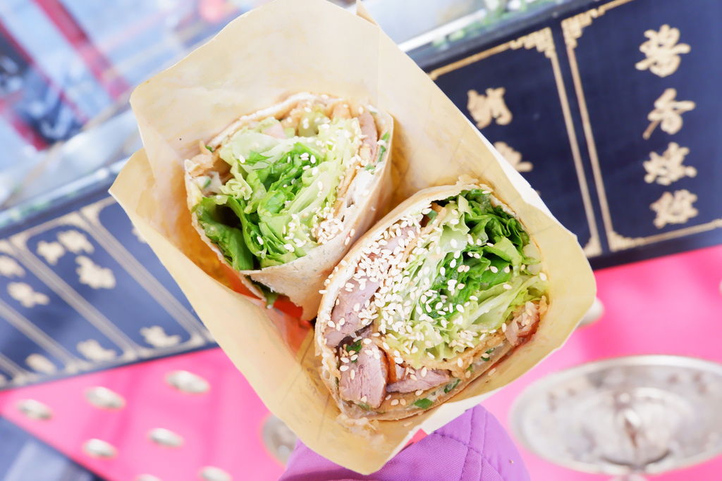 北京烤鴨口味的老大爺煎餅果子是非常暢銷的熱銷商品,粗糧男人味的態度,每一份煎餅果子都是用心製作,稍有不慎,麵皮就會製作失敗,需要重頭再來,極為費工,很需要專注力的,煎餅果子飽足感強大,物美價廉才85元銅板價,足足可以抵上兩餐,小鳥胃吃了2~3口就幾乎吃不下了,一份兩捲份量厚實,還有熟客天天都來指定購買「北京烤鴨煎餅果子」,使用自製的北京烤鴨、生鮮萵苣、每天現炸的餛飩皮叫做「薄脆」(看起來很像豆腐皮,吃起來卻能增加煎餅果子的特殊口感),切段裝袋後再灑上白芝麻點綴一番,袋子經過特殊設計還滿能保溫的,即使冷掉了,老大爺煎餅果子還吃起來更可口好吃,代表現點現做的美食是有口皆碑,好評不斷!