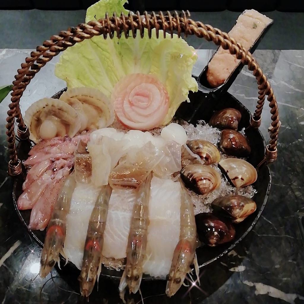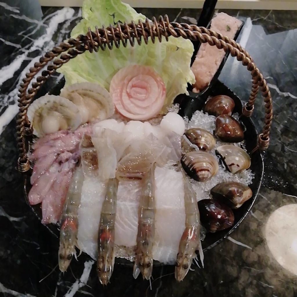 蛤蠣,鮮雕魚片,國宴魚,北海牛奶貝,深海花枝片,爽滑魚皮及大白蝦等品項聚集成美到讓人捨不得吃的海鮮藍,趁新鮮趕快一起下火鍋跟著鴛鴦鍋一起烹煮!