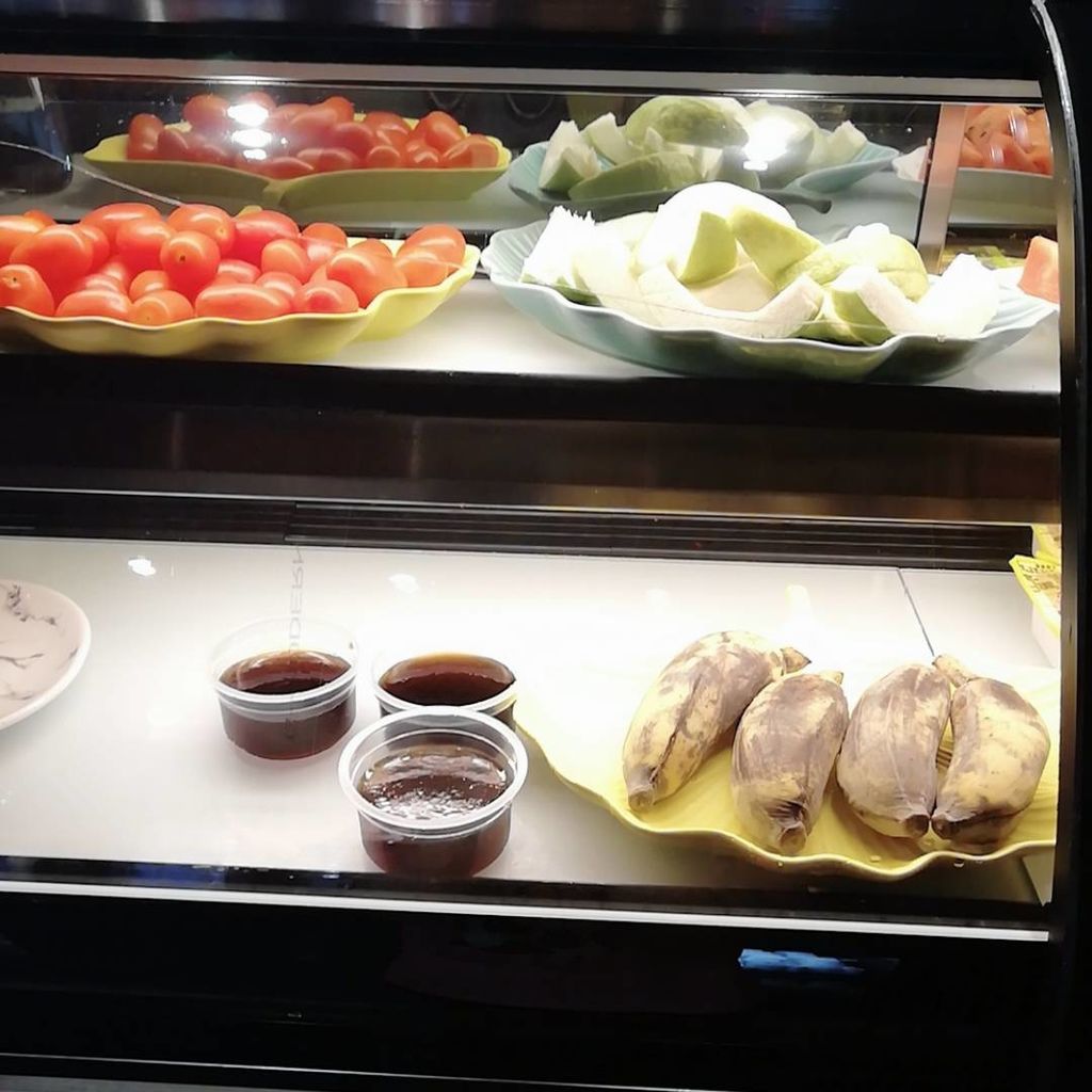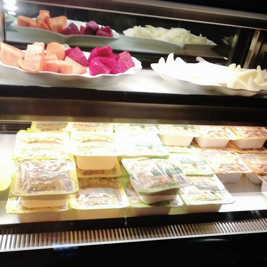 點心水果的部分則有黑磚奶凍(建議要加奶精球一起享受),中華豆花,中華豆花水果風味,中華甜愛玉,火龍果切塊,西瓜,番石榴,小聖女番茄,洋香瓜,芭蕉~~