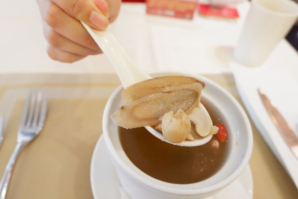 我點了品盛悅素軒的桂香套餐,第一道菜全素的清燉牛蒡腰果盅,嘗起來是溫潤可口又養生的藥膳湯,添加腰果、枸杞、牛蒡、蓮子、香菇等,喝起來清爽又帶點綿密香濃的口感!