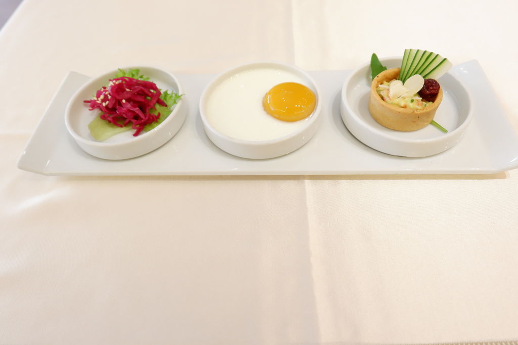 分子料理是近年來精心製作的前菜--桂香精緻臻品(奶素),服務上會詳細解說食用方式,依序是從小黃瓜塔塔醬塔→芒果奶酪→梅子醃製過的紫色高麗菜,避免小黃瓜塔塔醬塔會軟掉,清爽濃郁口感嚐來入口即化,最特別是看似月圓般的芒果奶酪,輕盈透明果膠包覆著淡雅甜酸的芒果汁,不小心戳破月圓般的芒果,奶酪吃起來超級無敵美味,清爽無負擔又很養生,而紫高麗菜絲酸甜開胃,幫助消化,說真的小鳥胃的人,來吃桂香套餐都可以足足抵上兩餐,很適合愈多人來吃品盛悅素軒更好,這樣大家都可以享受到美食!