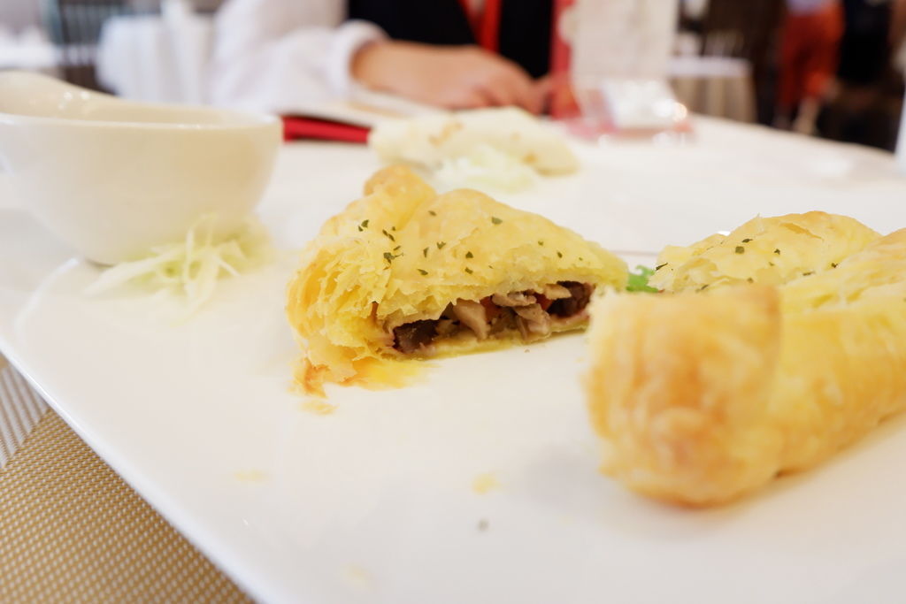 手做起司酥皮派餃佐墨西哥輕莎莎醬,天啊~~好吃到讓人驚艷不已,嘗起來非常像中式香菇肉燥般的鹹點心,手做起司酥皮派餃佐墨西哥輕莎莎醬,是我最喜歡的料理,來品盛悅素軒也可以每道菜都可以吃的很讓人驚呼美味,結合西餐的精細手法,做出美味的手做起司酥皮派餃佐墨西哥輕莎莎醬,手做起司酥皮派香濃卻不膩口的口感,吃起來很像香菇肉燥糕點,更難以置信是素食的方式,製作出這樣有創意的鹹酥派!