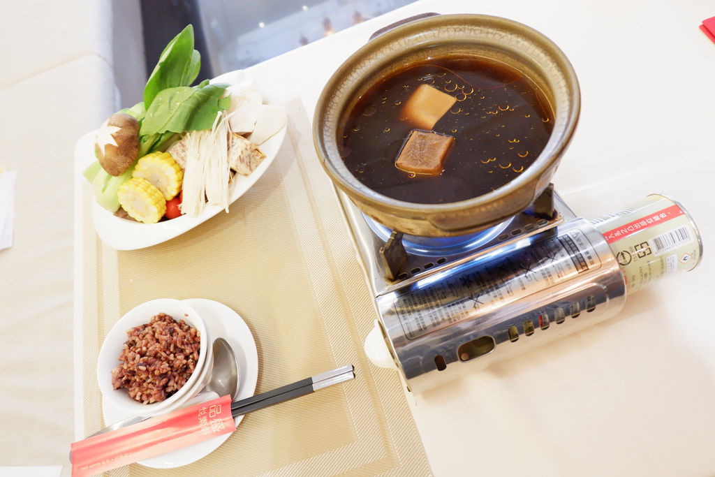 桂香套餐的主菜可以六道主菜選一道,有野菌牛肝菌細扁麵,手炒椒麻鍋物,三杯猴頭菇,五香沙茶鍋,鮮蔬白味噌鍋,泰式椰漿咖哩蔬菜煲,菜單上每道菜皆有註明是全素或是奶素,如果不吃蛋的人可以點沒有蛋的素食料理,我點了是藥膳湯頭的手炒椒麻鍋,等到端上來時讓人意外不已,原來是能讓喜歡吃火鍋的客人,盡情享受烹煮火鍋之樂的瓦斯爐,佐以養生紫米飯,份量多到物超所值,豐盛到足以打包一半火鍋帶回去,椒麻湯頭散發著獨特養生風味,意外嘗起來不會過於太辣,老少咸宜,即便不吃辣的小孩也能接受,藥膳風味的手炒椒麻鍋,即便在炎夏也有養生滋補的效果,陶鍋小火鍋的型態端上紫米飯,大量養生健康的菇類像是杏鮑菇等、聖女小番茄、青江菜、高麗菜、玉米、南瓜、絲瓜、金針菇、凍豆腐、芋頭,最特別是芋頭,美味健康吃得見,光是芋頭吃起來就跟坊間便宜火鍋店吃起來大大不同,需要耐心烹煮至入口即化,粉質綿密的口感讓人回味無窮~~菇類富含對身體極有益處的多醣體及優質纖維質,大家熟知能增強免疫力的多醣體,具備防癌抗癌的功效,菇類更能替代肉類,增加飽足感,通通丟入小火鍋享受吃火鍋的樂趣~~