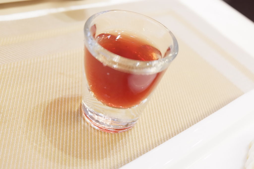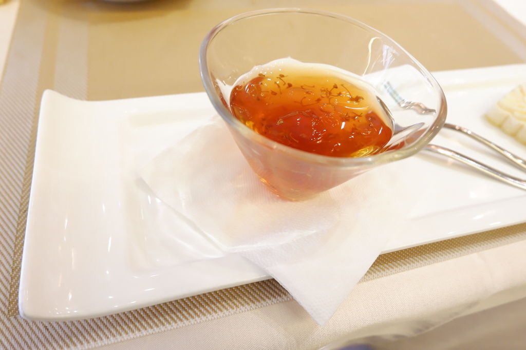 終於來到最讓人期待的甜點,最後一道甜點是茶香桂花凍搭配雪藏綠豆糕,我本人其實很怕吃冰冷食物,但是茶香桂花凍溫度都能讓人接受,嚴選蒟蒻手工製作,不像一般傳統吉利丁製作的果凍,桂花香氣清香撲鼻,嚐來清爽甘潤回甘,退火養生又清涼消暑!