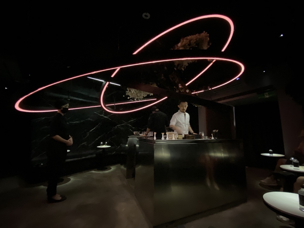接著打開門簾後就是餐酒館的用餐區,第一眼看到有種驚喜感。調酒區在整個餐廳的正前方,座位圍繞者調酒區。彷彿調酒者才是主角,而我們則是享受一場秀的賓客。