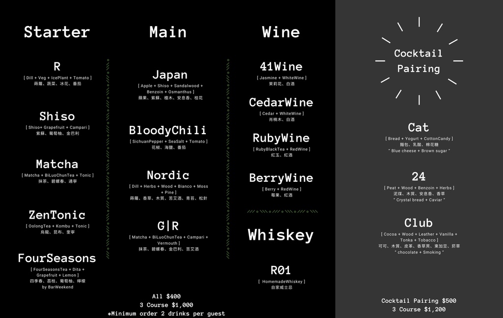 而筆者今天入場時間為晚上七點半,原本想說點個兩杯低消嚐嚐鮮就好,沒想到七點到十點之間有季節性的套餐,約兩到三個月換一次。本季的菜單主題跟日式有關,整個套餐為NTD 1,500,服務費10%。上酒的方式則會由右到左一道一道上。
