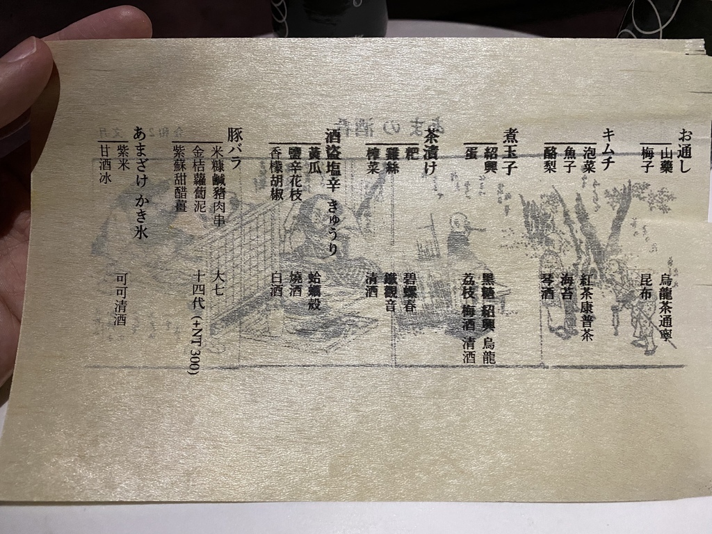此道的酒品可以選擇大七或十四代,十四代要另外加NTD300,以口感上大七喝起來較為強烈,而十四代較微溫韻甘甜。