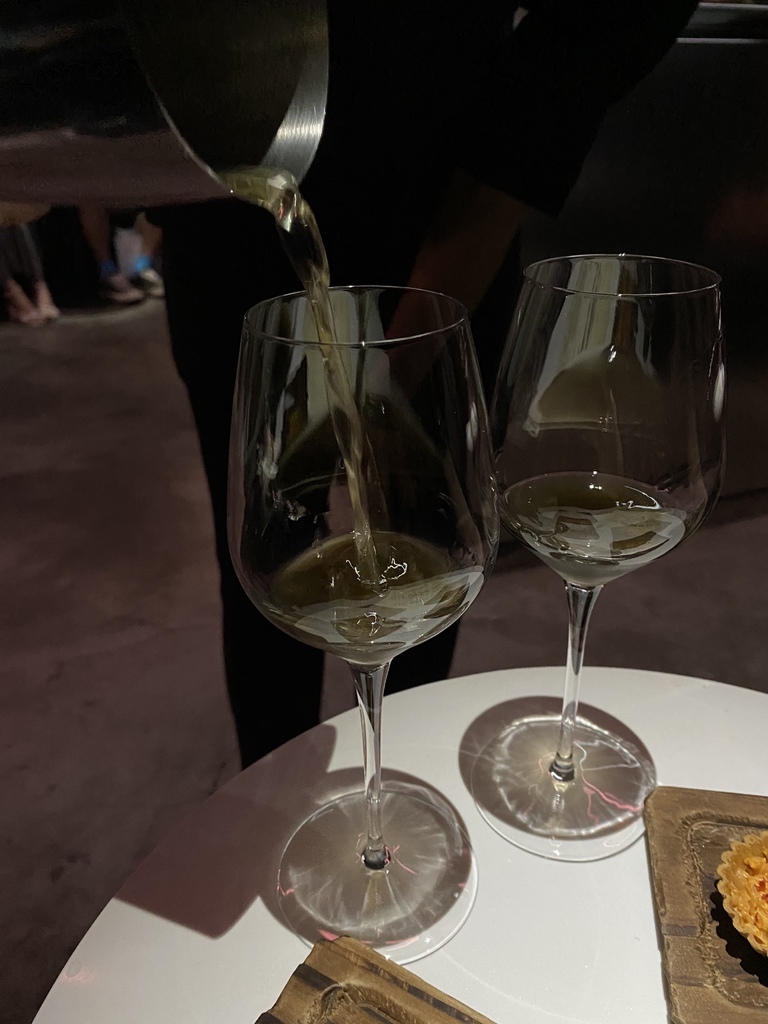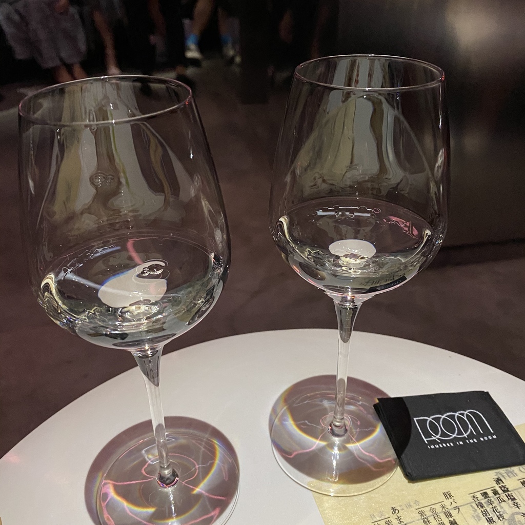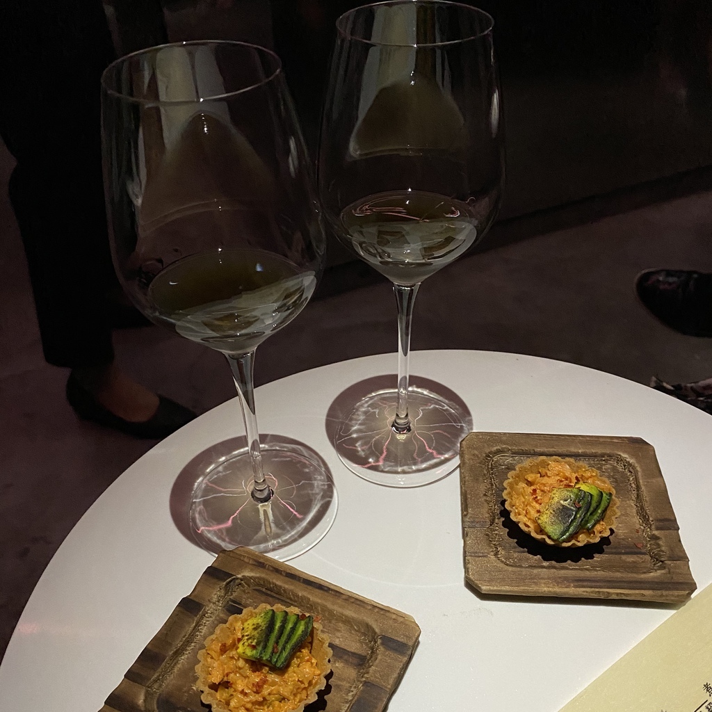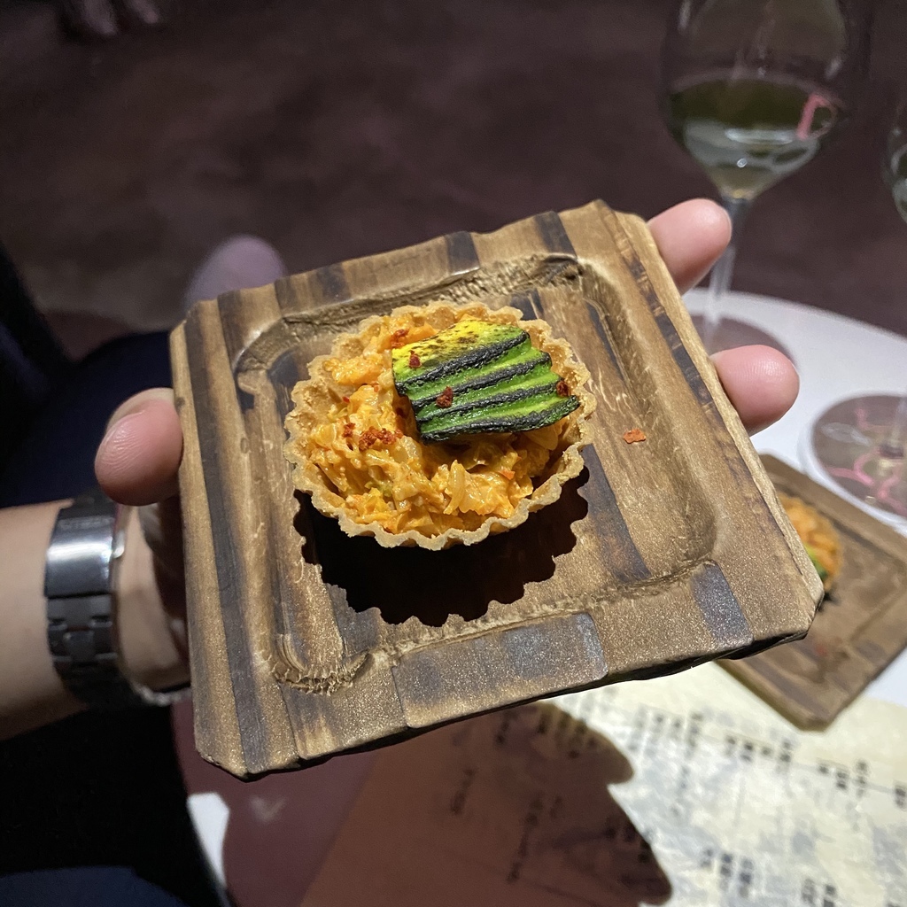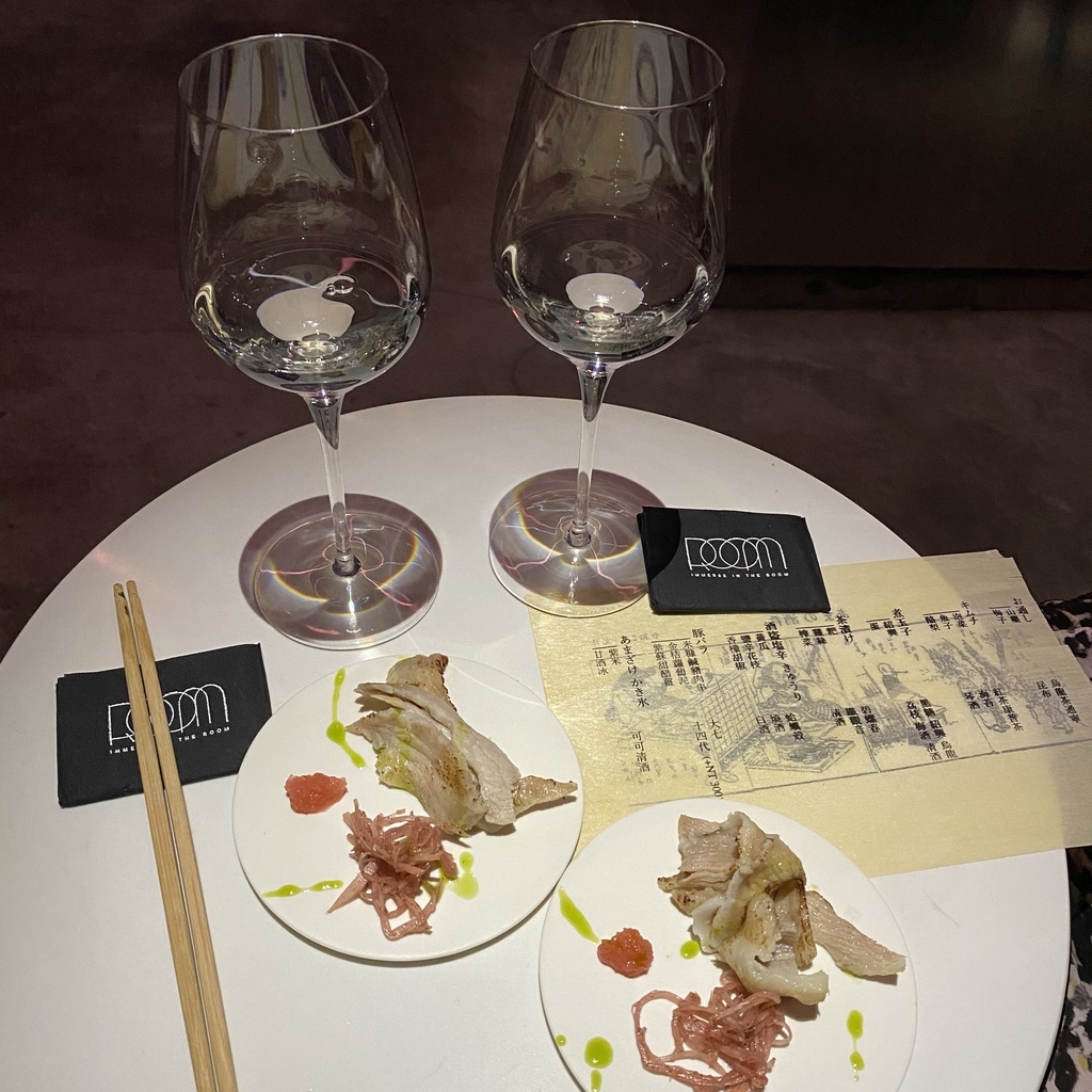 剛坐下後兩人會共用一個小餐桌,店員很貼心的介紹本季菜單主題,並再次講解用餐規則後便準備上酒。因為本季菜單是日式主題,因此餐廳背景音樂也選用日式的音樂,而擺盤設計者則是陳小曼(對食物擺盤設計有興趣的可以參考他的連結:https://slow-food.design)