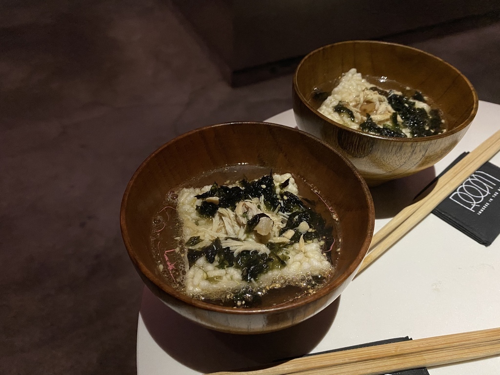 先上的是粑+雞絲+榨菜,接著將微熱的清酒+鐵觀音+碧螺春倒入,可依照個人對粑的軟硬度喜好選擇入口的時間。以茶泡飯的方式呈現。粑和清酒互相襯托,有米的香氣,而清酒下肚後已經在體內開始發酵