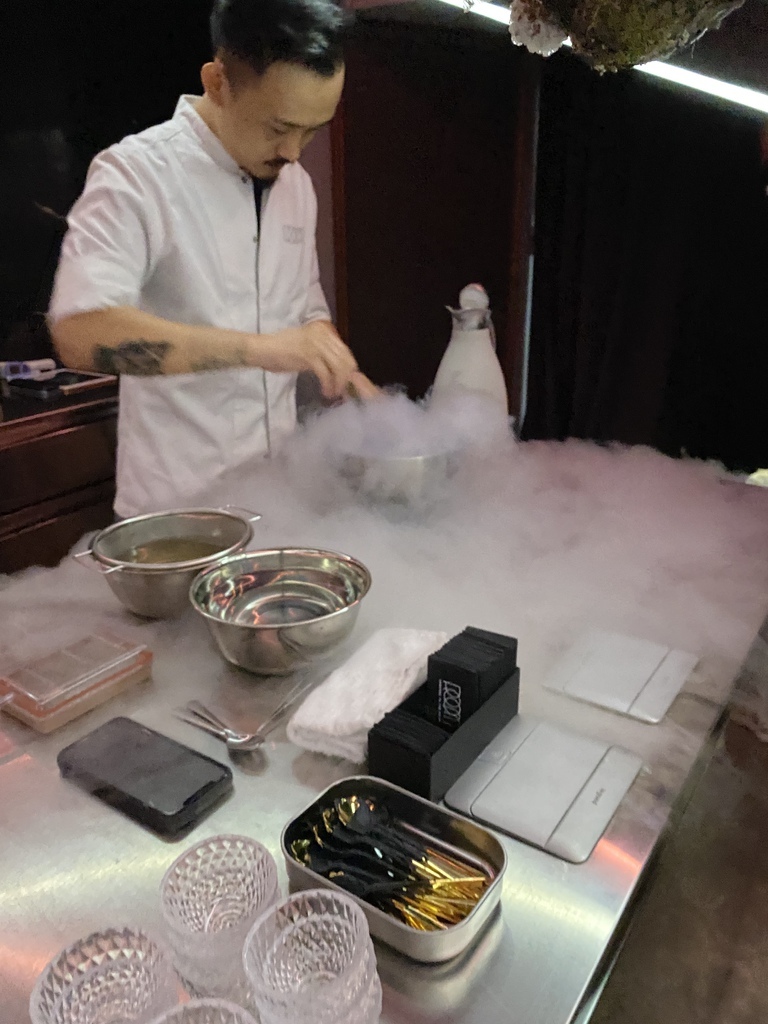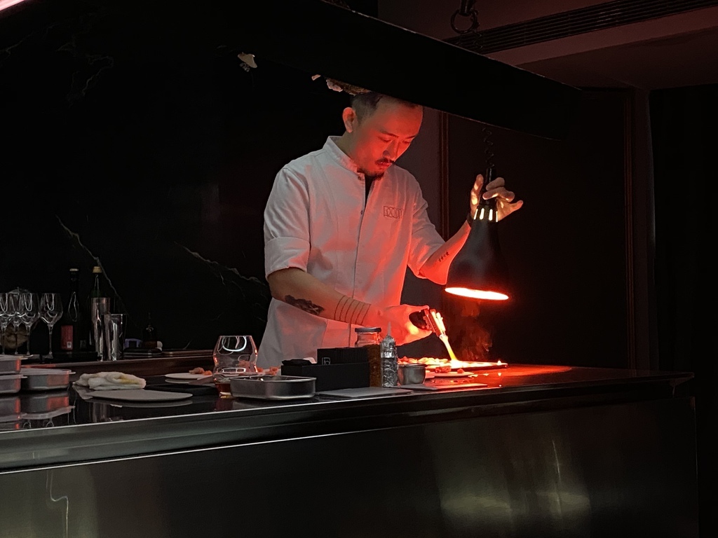 在飲用的四道的同時中間的吧檯已經在準備第五道的豬肉,香味與視覺效果十足。