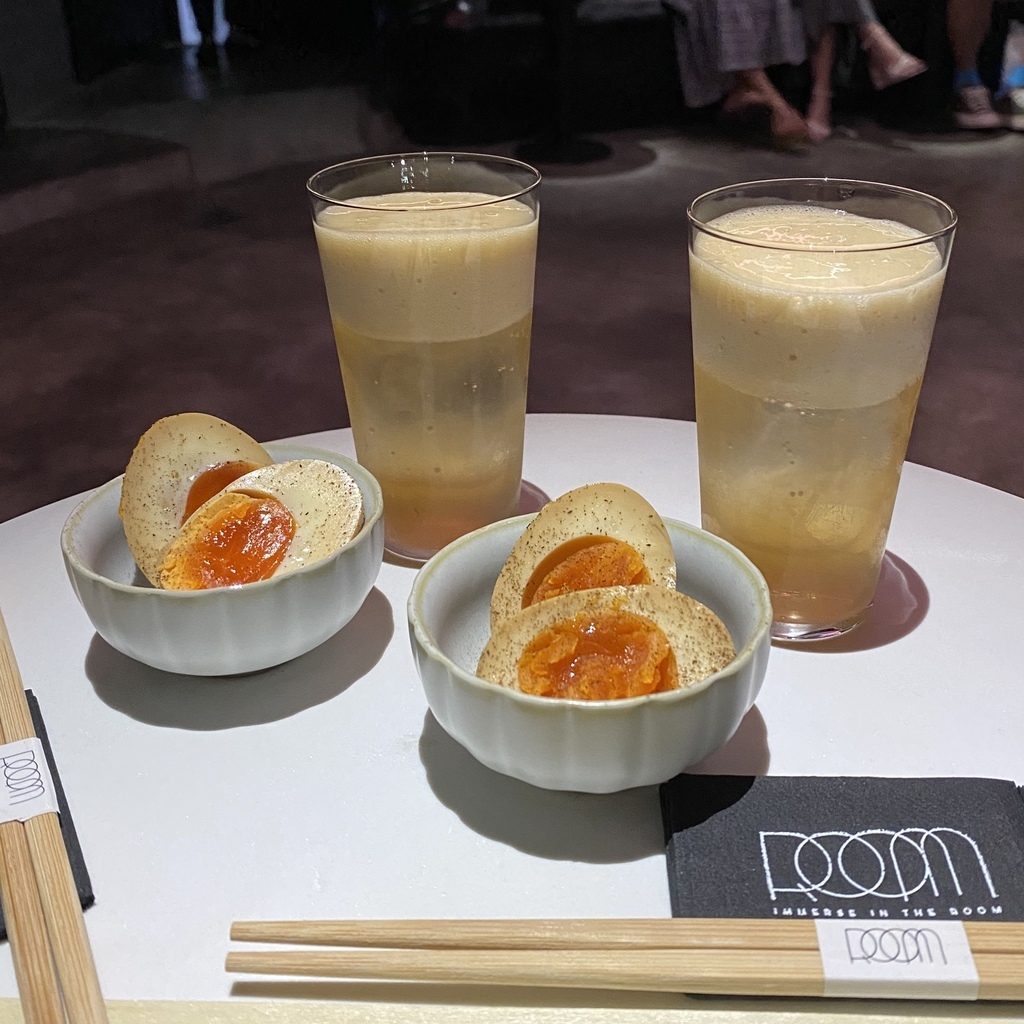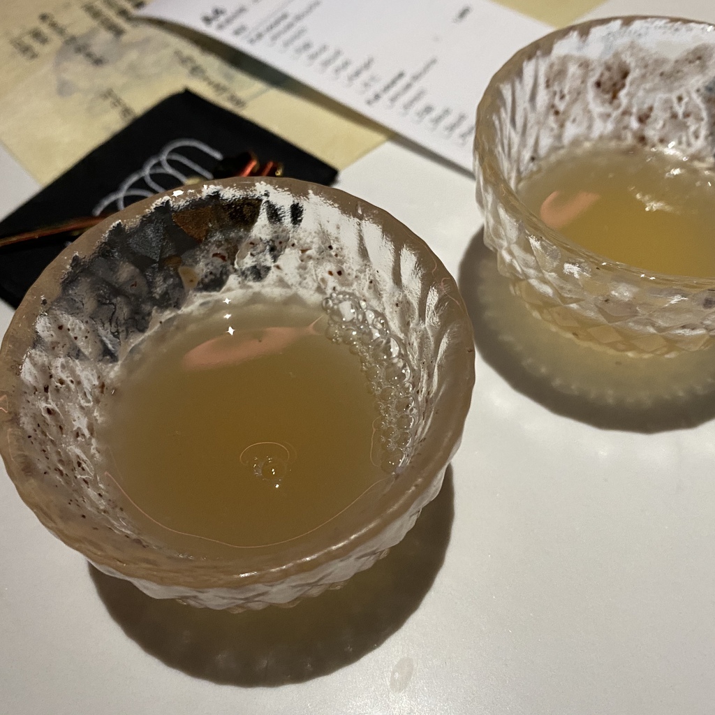 最喜歡的一道酒,以啤酒的外觀作為包裝,上頭的氣泡有著黑糖的香味,入口後先是梅酒的甘甜,接著是紹興的香,最後的最後才是清酒的氣味。口感上則有綿密的泡沫襯托