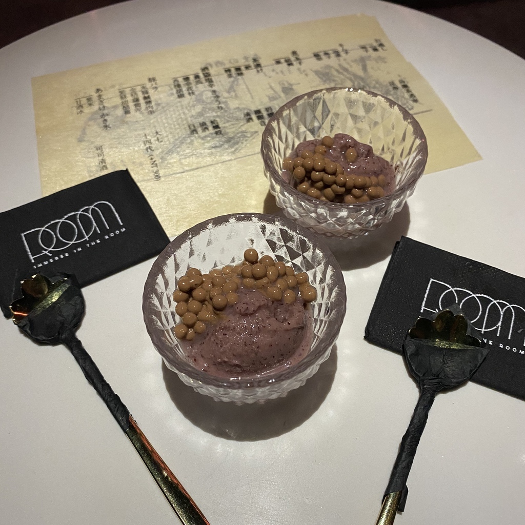 最後一道以甜點的形式呈現,下方是紫米與甘酒冰,上方黑色的則是入口即化的可可口味的清酒,微甜並帶點清酒的香氣畫上美好的句點
