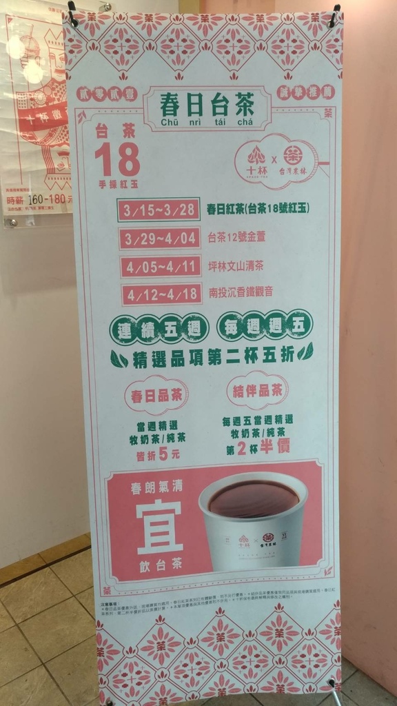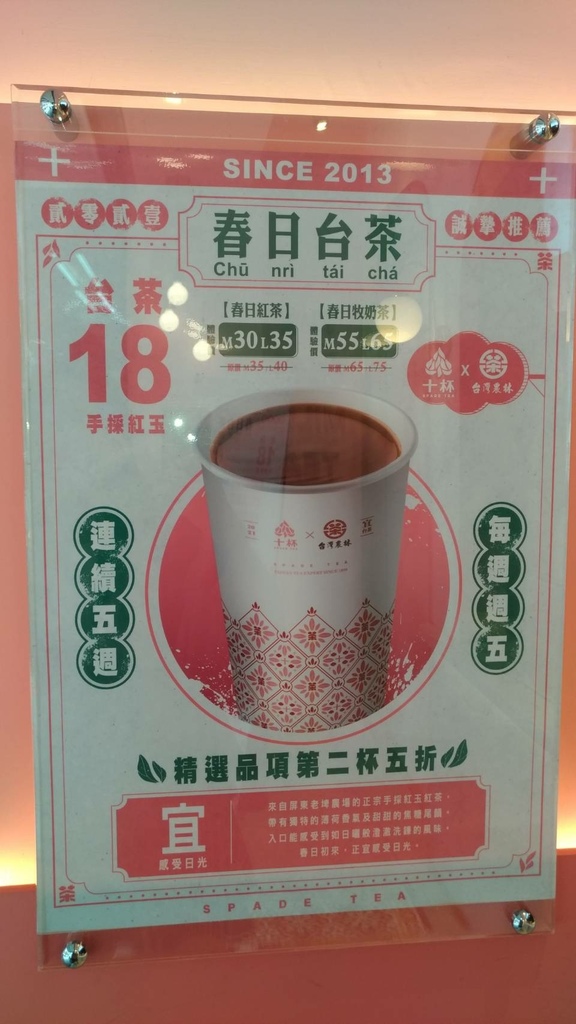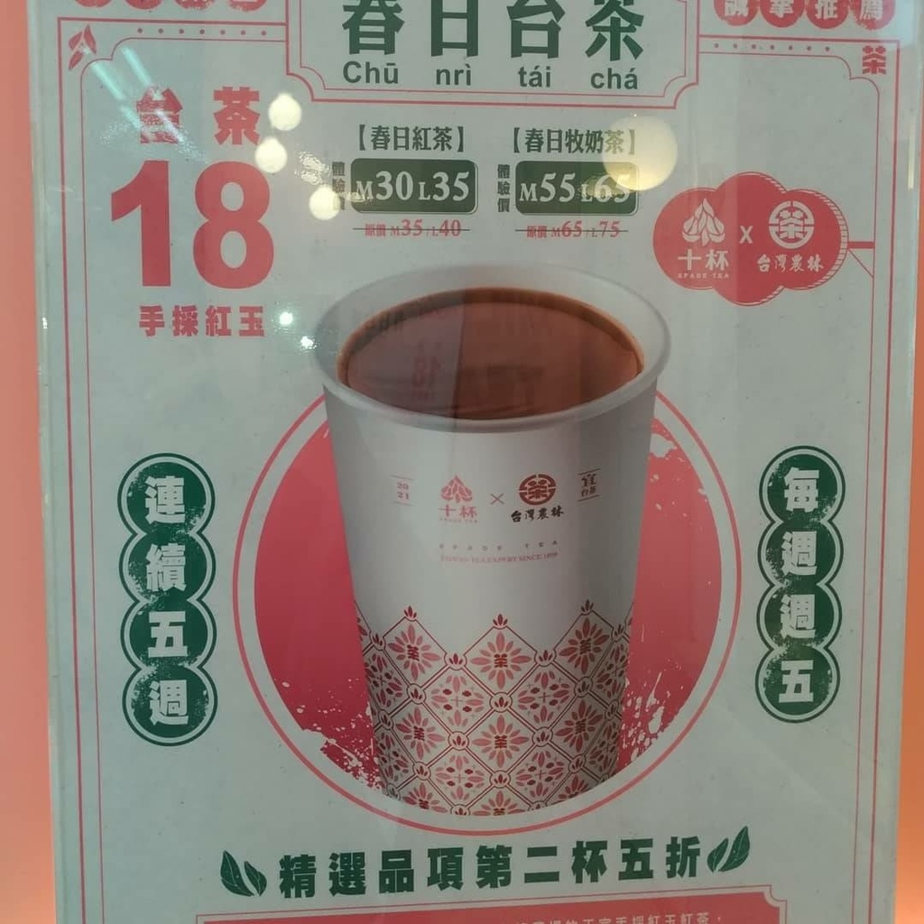 十杯莊敬店推出台灣農林跨屆合作之春日紅茶(台茶18號紅玉)、春日牧奶茶 (鮮奶茶:台茶18號紅玉+小農鮮奶),就是饕客來十杯的必點暢銷商品,「台灣農林」精選茶種紅玉紅茶,將在這個春天和「十杯」小農牧場鮮乳撞擊出絕妙風味的牧奶茶!首波於3/15主打台茶18號手採紅玉的「春日紅茶」、「春日牧奶茶」,一連兩週都有優惠,採用來自屏東老埤農場的正宗手採紅玉紅茶,帶有獨特薄荷香氣及焦糖尾韻,一杯在手彷彿就能感受到大武山下的翠綠芳香和屏東獨有的艷陽氣息。