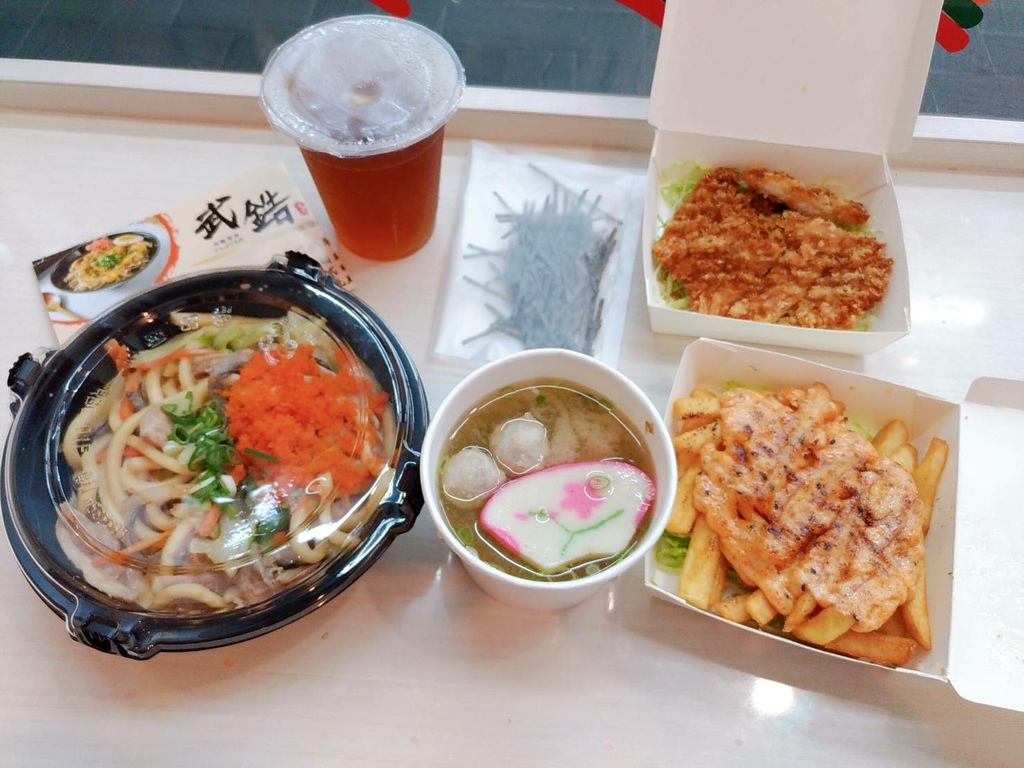 武鋯食堂¥丼飯專賣どんぶりもの號稱武鋯難忘的美味! 外帶餐具也不含糊,配料為了貼心客人飲食需求,海帶絲會分開放,我點了明太子雞炒烏龍、薯條(炙燒明太子口味)、日式豬排、紅茶及味噌湯,像這樣份量對女生來說都可以抵兩餐了,價格在台北市也相當經濟實惠!