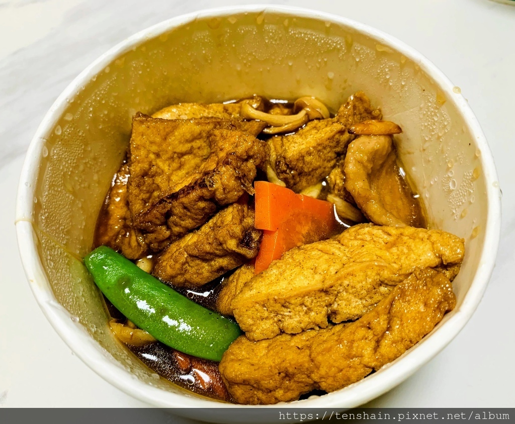 紅燒燜豆腐 ( 蛋素 ) ,這道菜是將豆腐炸過,再與美白菇等食材以古早味蔥燒醬汁燜煮滷製。與前兩道菜比起來,口味偏清淡。豆腐吸飽了滷汁,一口咬下,滿口的湯汁,吃起來不會有負擔,湯汁也適合拿來淋在白飯上食用。