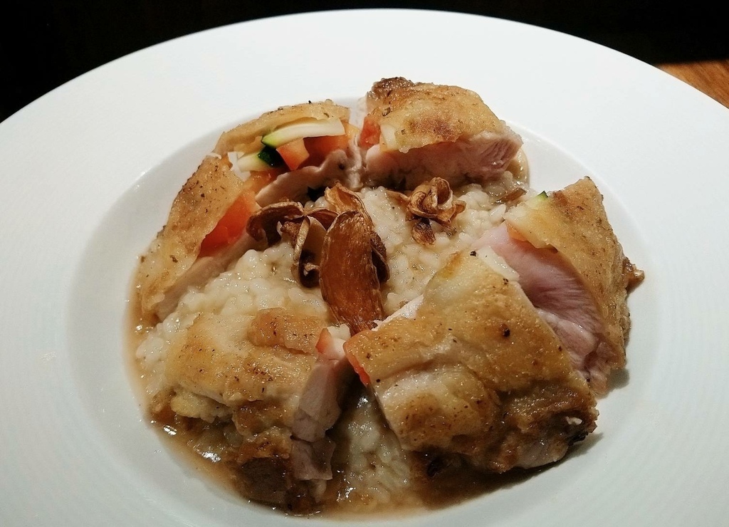 Alba日出義式餐酒館&洋酒專賣店必吃的招牌餐點首選,就是「麻油雞腿燉飯」,超豪氣使用整份飽滿巨大的雞腿排,鐵板燒慢慢細心油煎,呈現出鮮嫩多汁的美味口感,更特別的是,雞腿排的雞皮與滑嫩多汁的雞肉中夾了小黃瓜與紅番茄切片,讓雞腿排不僅僅是普通的雞腿排,還有令人驚喜的創意!雞腿排帶著淡淡的麻油香氣,暖呼呼的老薑非常適合連日來的劇烈低氣溫,「麻油雞腿燉飯」口感吃起來軟Q中帶點硬,飄著麻油誘人香氣,結合中西料理的優點,而且雞腿排不會過於油膩,是CP值高、用心製作的美食,份量適中的「麻油雞腿燉飯」,飽足感很強!