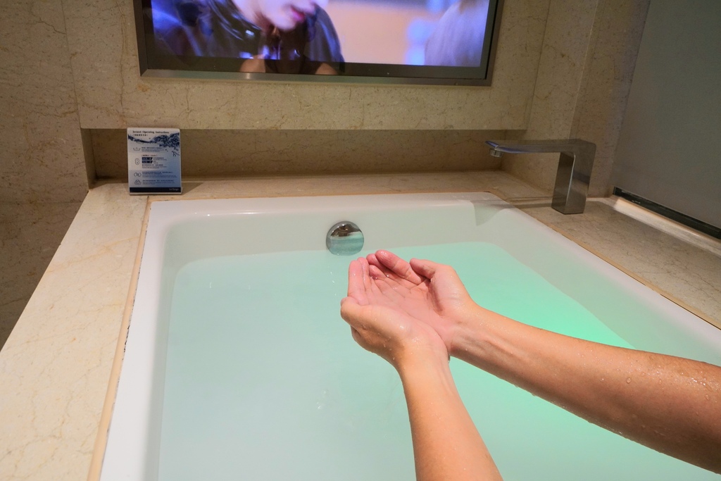 天閣酒店劍潭館的浴室小金很滿意~哈哈!裡頭有獨立的電視可以看而且是超大的浴缸耶,還設置了起泡泡的設備在裡頭所以當天小金自個兒就到藥妝電買了入浴鹽回來泡澡了。