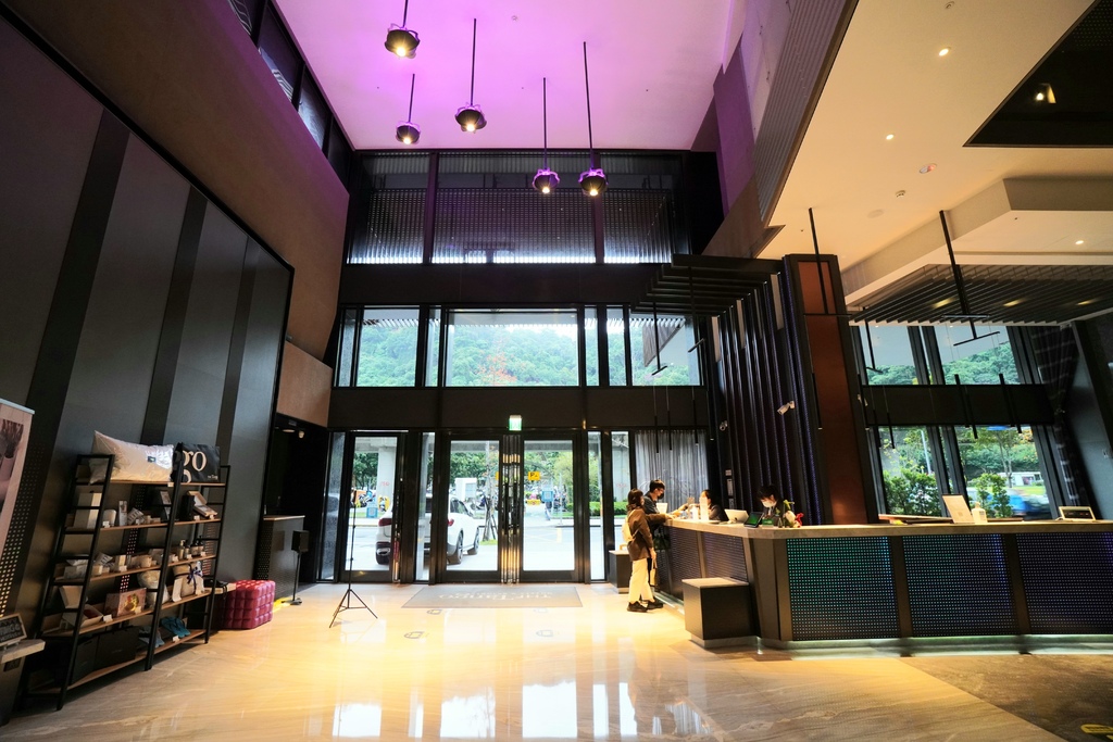 天閣酒店劍潭館整體的設計色調非常的穩重又不失時尚感,灰黑色調再配上紫色、黃色…等燈光計畫低調又有質感,挑高的接待大廳也十分的舒適寬敞。