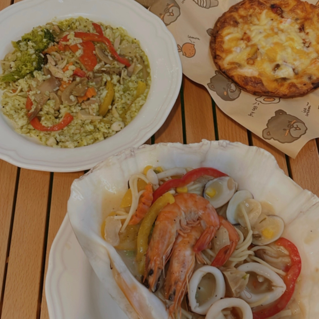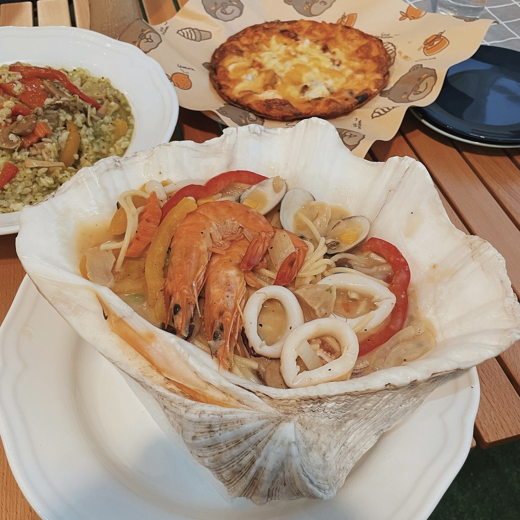 濃郁的奶油白醬配上海鮮配料交織成無與倫比的美味,再搭配上浮誇的貝殼當作碗不拍照真的很可惜,義大利麵利麵有菇菇還有甜椒,不喜歡這兩個味道的一定要提前告知