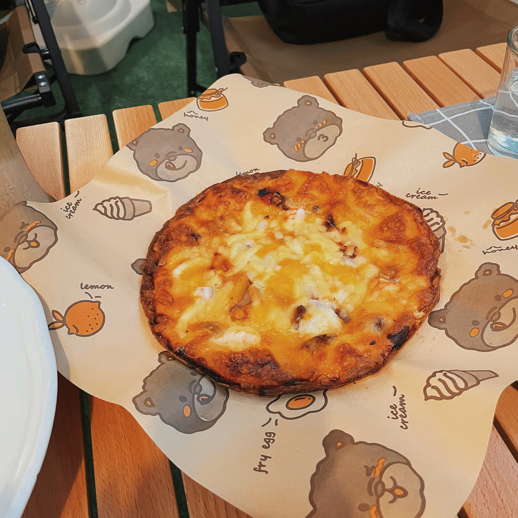 小小的Pizza大大的驚喜薄薄的餅皮搭配上不會膩的起司,完全不會有很膩的感覺一人一片真的是剛剛好的,完全不輸外面的手工Pizza的口感