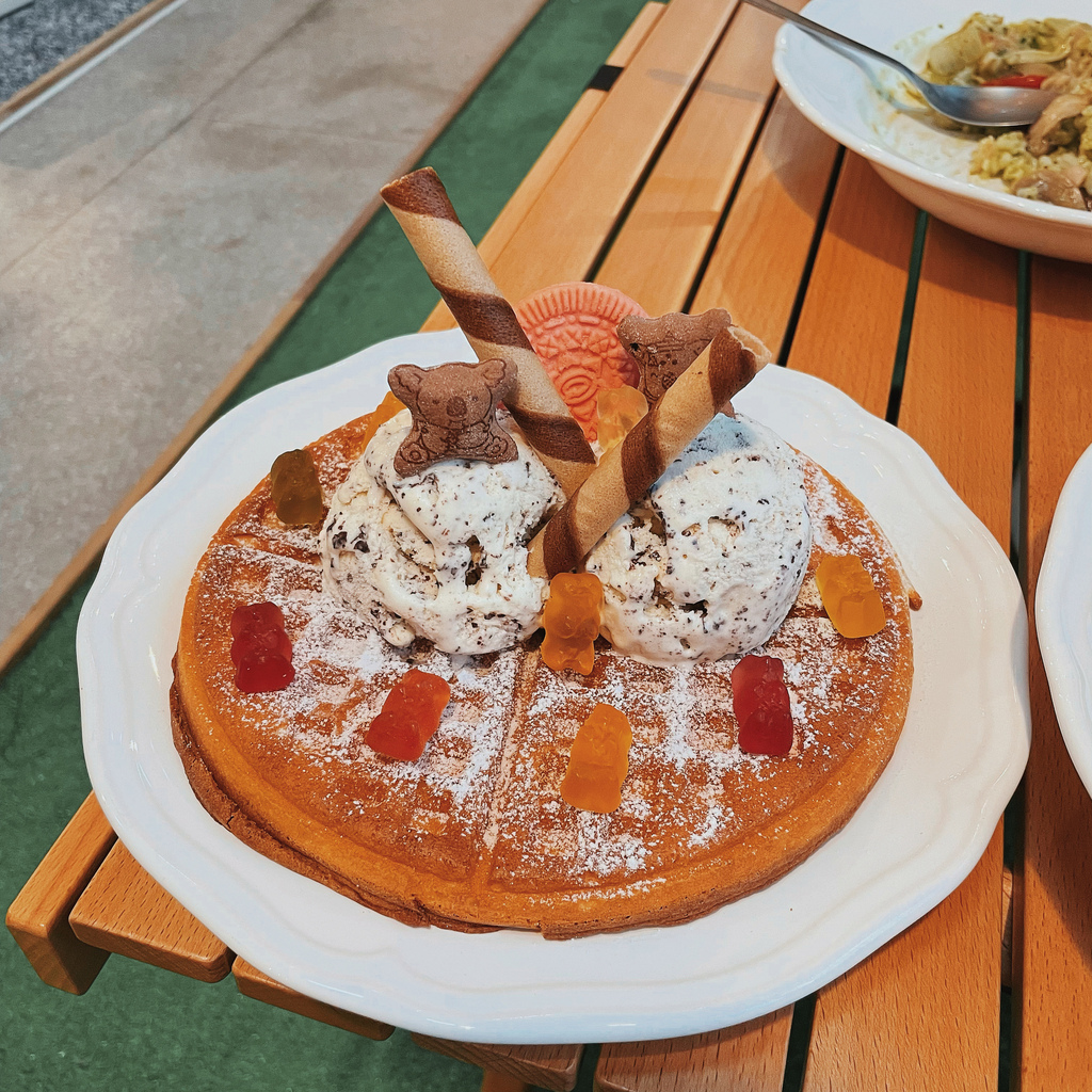 扎實的鬆餅他配上兩球瑞士巧克力冰淇淋,在用小熊餅乾與軟糖還有脆笛酥點綴最特別的是粉色Oreo在女生看來真的是超級網美,但味道完全不會是那種只能拍照不好吃的,因為鬆餅很扎實一定要搭配冰淇淋吃就會剛剛好
