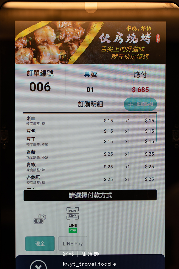採用自助式點餐機的點餐結帳的伙房燒烤台北創始店,可使用現金、LinePay、街口支付付款。