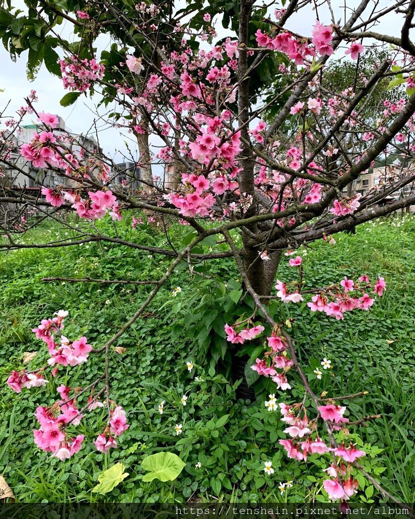 樹上的粉紅櫻花,和地上的小白花相映成趣。